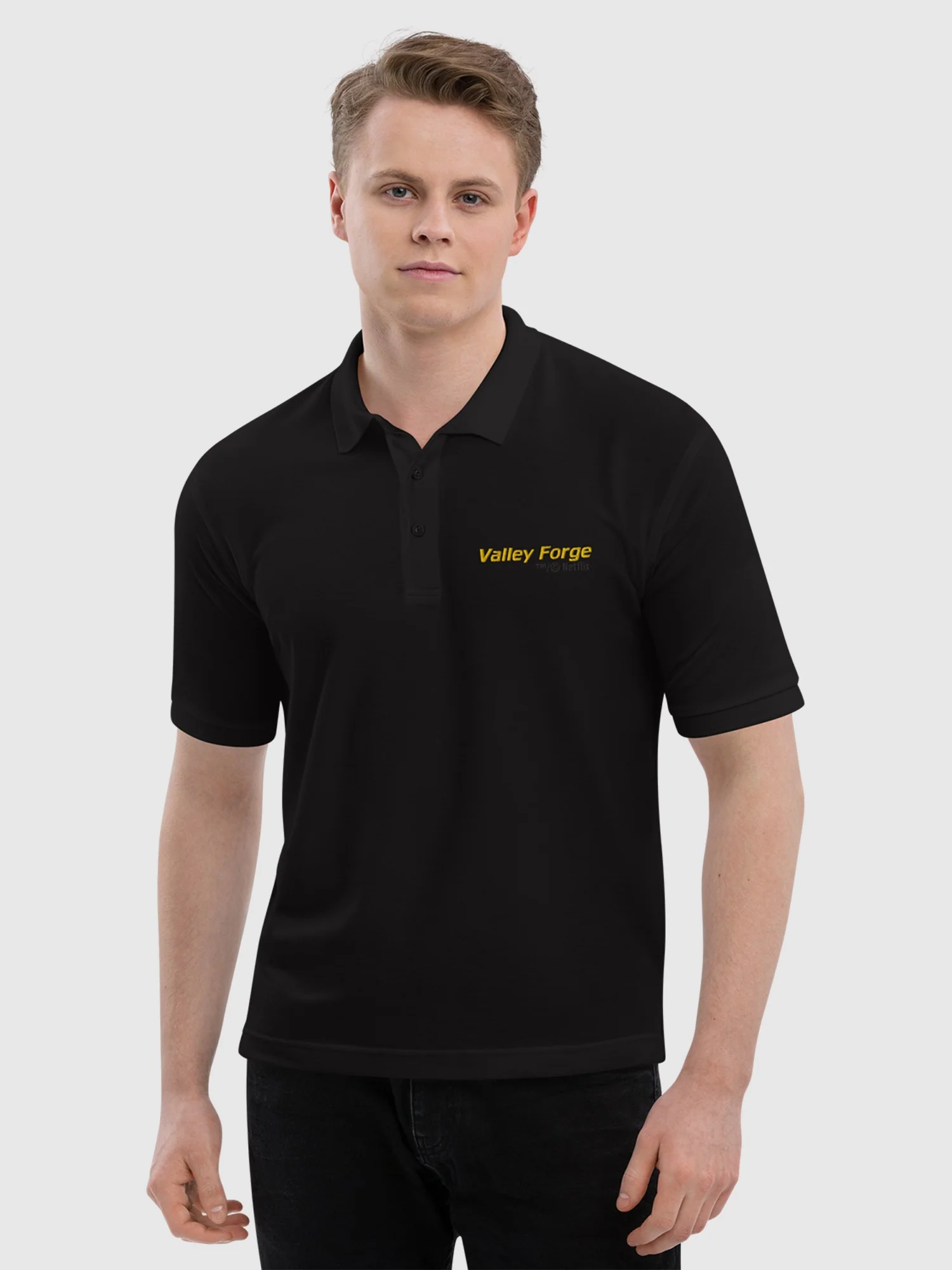 Elevate your casual style with this subtly cool Tires Valley Forge Automotive embroidered polo shirt. Featuring a refined embroidered logo of the iconic shop from the Netflix hit Tires, this polo offers a more sophisticated way to show your appreciation for the show's unique humor. Made from quality fabric, it's comfortable enough for everyday wear but sharp enough for a casual outing. It's a nod to your favorite mechanics without being too over-the-top.